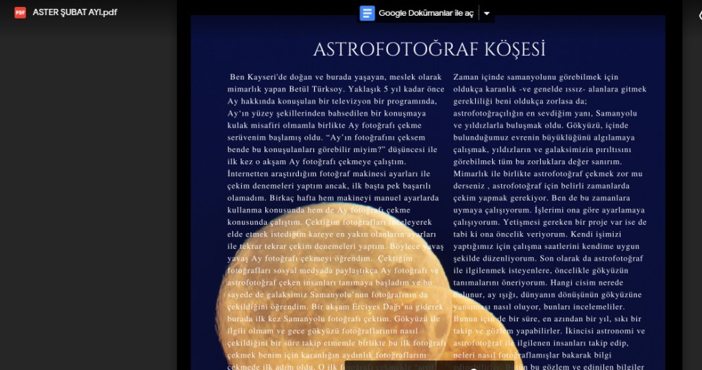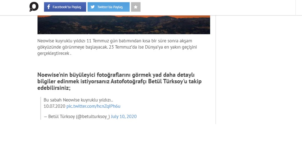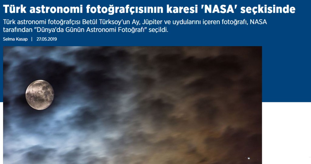 Haber ve Röportajlar Basın ve Sosyal Medyada yer alan haberler ve yazılar. Anadolu Ajansı APOD / Röportaj Şehir Dergisi Kayseri Fotoğrafları Hürriyet APOD Milliyet Neowise Aster Astrofotoraf Yeni Şafak Pazar Eki /Röportaj Lacivert Dergi Astrofotoğraf / Röportaj Genç Dergi Astrofotoğraf / Röportaj Onedio Neowise Tele 1 Astrofotoğraf Bunu paylaş: X'te paylaşın (Yeni pencerede açılır) X Facebook' da Paylaş (Yeni pencerede açılır) Facebook Share on Pinterest (Yeni pencerede açılır) Pinterest Yazdır (Yeni pencerede açılır) Yazdır Reddit'te paylaş (Yeni pencerede açılır) Reddit Telegram'da paylaş (Yeni pencerede açılır) Telegram Beğen Yükleniyor...